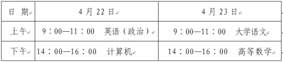 统考科目为4门公共基础课,包括英语(专科期间公共外语课程为非英语的考政治)、计算机、大学语文、高等数学(分为高等数学Ⅰ、高等数学Ⅱ、高等数学Ⅲ),具体考试科目设置情况见附件4。每门科目考试时间120分钟、满分100分,总分满分400分。省教育招生考试院统一命题,统一考试,统一评卷。各科考试时间安排如下: