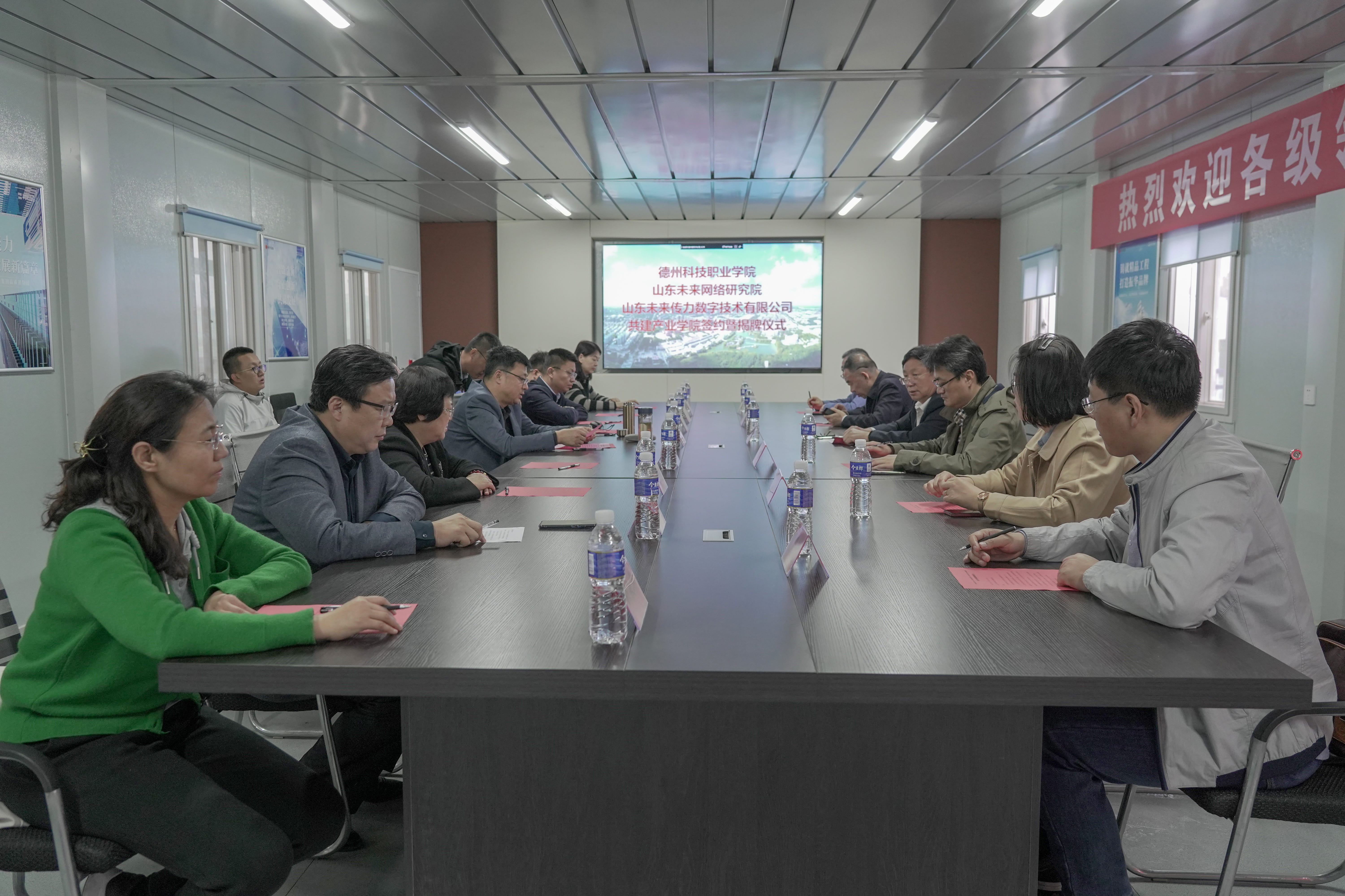 德州天衢新区党工委委员、管委会副主任申毅,山东未来网络研究院党委副书记、副院长李树军,山东未来集团副总经理徐小传,山东未来传力数字技术有限公司董事长阚延魁,德州海川投资有限公司董事长刘晓鹏,学院首任书记、院长朱国材,党委书记刘继泉,党委副书记、执行院长宫淑瑰出席签约暨揭牌仪式。党委委员、副院长周伟主持签约仪式。
