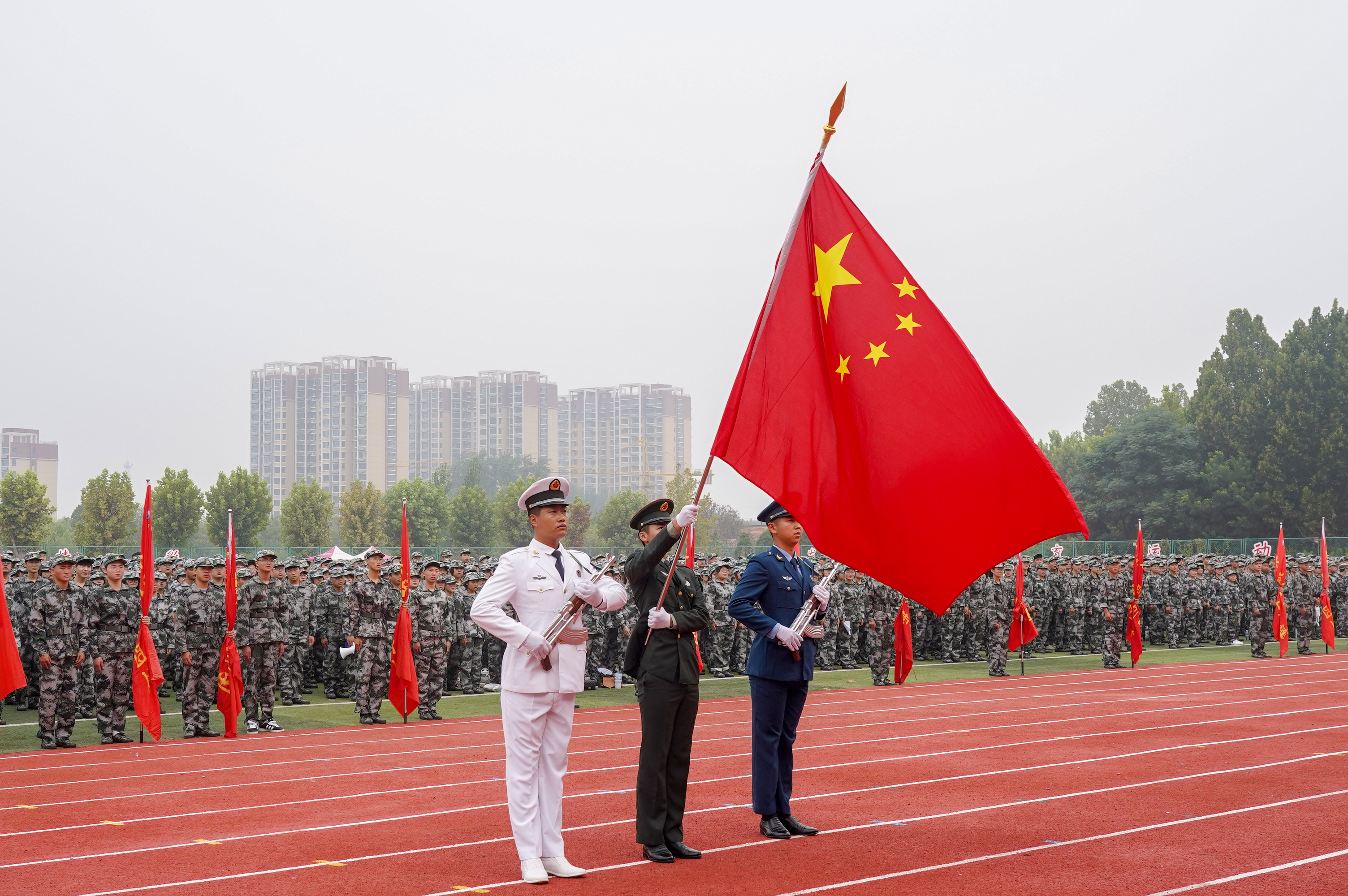 军训动员大会在雄壮的《义勇军进行曲》中拉开帷幕。国旗护卫队昂首阔步,护送鲜艳的五星红旗走到主席台前,全体师生肃立注目、奏唱国歌。