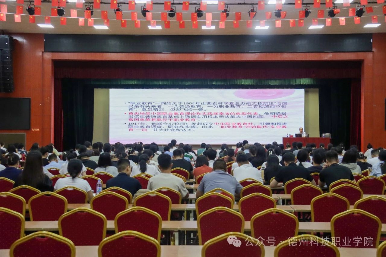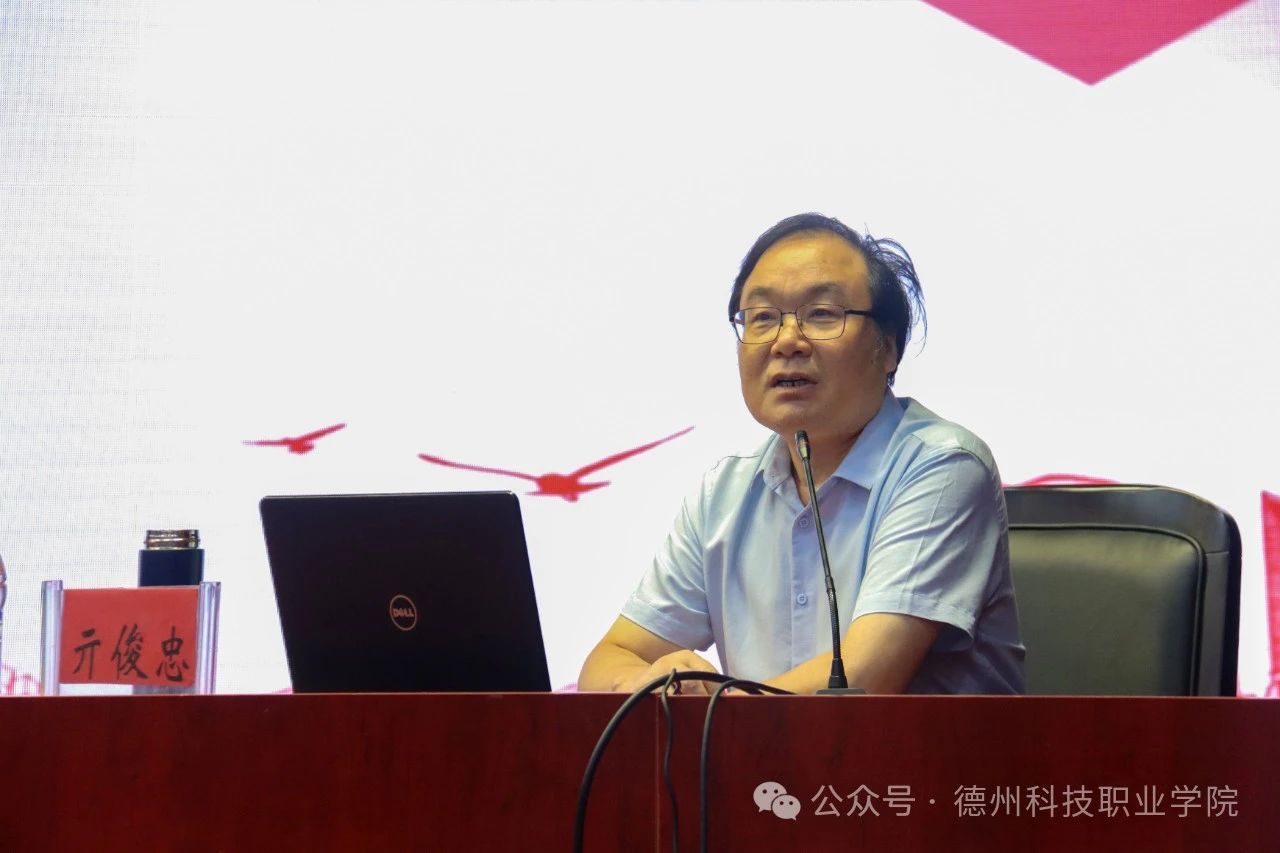 亓俊忠代表学校对新教师的入职表示诚挚欢迎,并从职业教育发展简介、职业教育大有可为、如何做一名优秀的高校教师等方面展开细致深入剖析讲解。通过精美的课件、典型案例以及数据支撑,亓俊忠教授全面系统地介绍了现代职业教育体系的内涵、特点,分析了我国职业教育发展阶段的现状与优势,强调了建设现代化教育强国的战略逻辑与支撑,让学员们从多角度、全方位认识并掌握新时代新形势下高校教师应具备的职业责任、综合素质和专业能力,同时结合我国当前职业教育教师队伍提升与建设的实际情况做了分析、提出建议,引起现场学员的阵阵掌声。