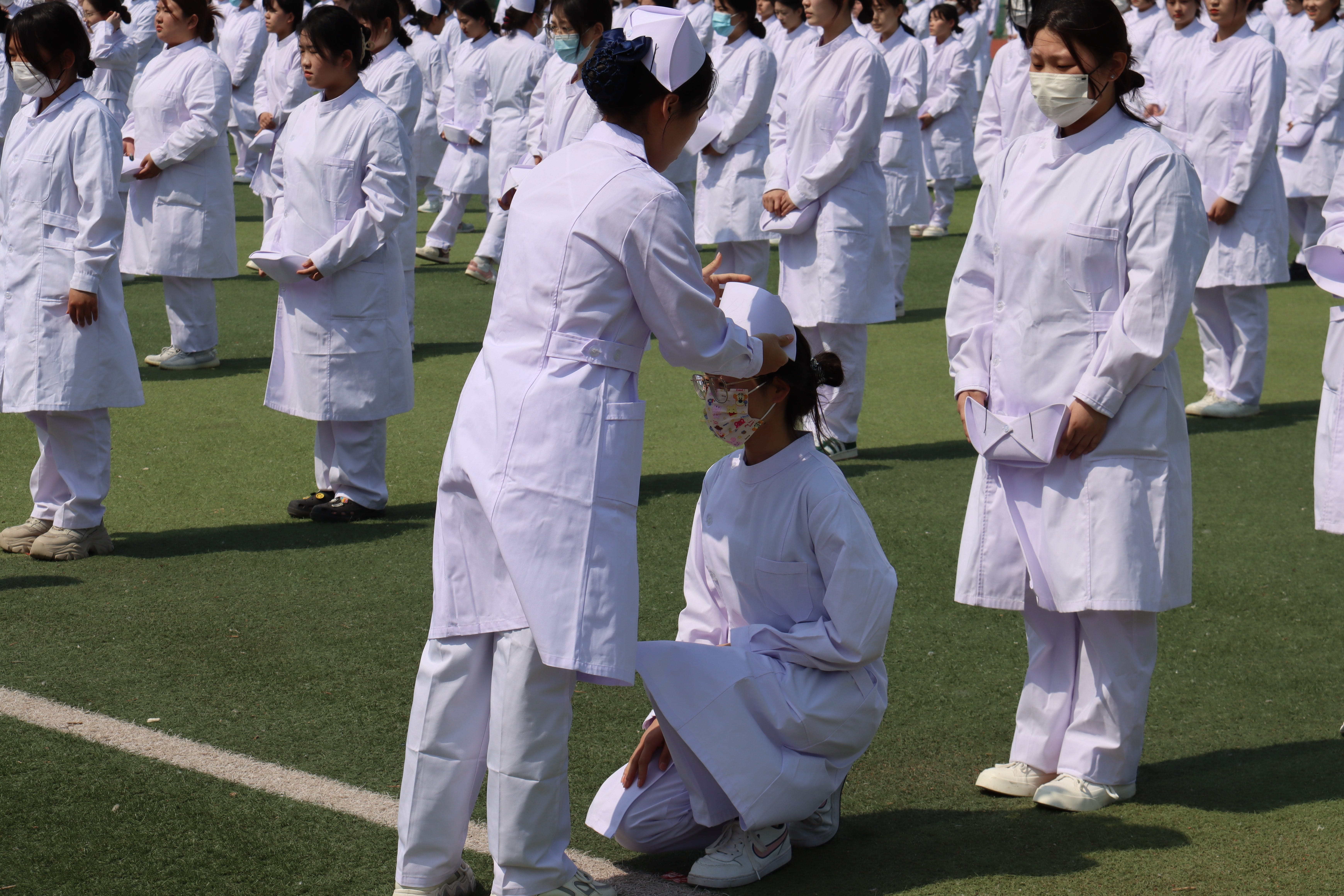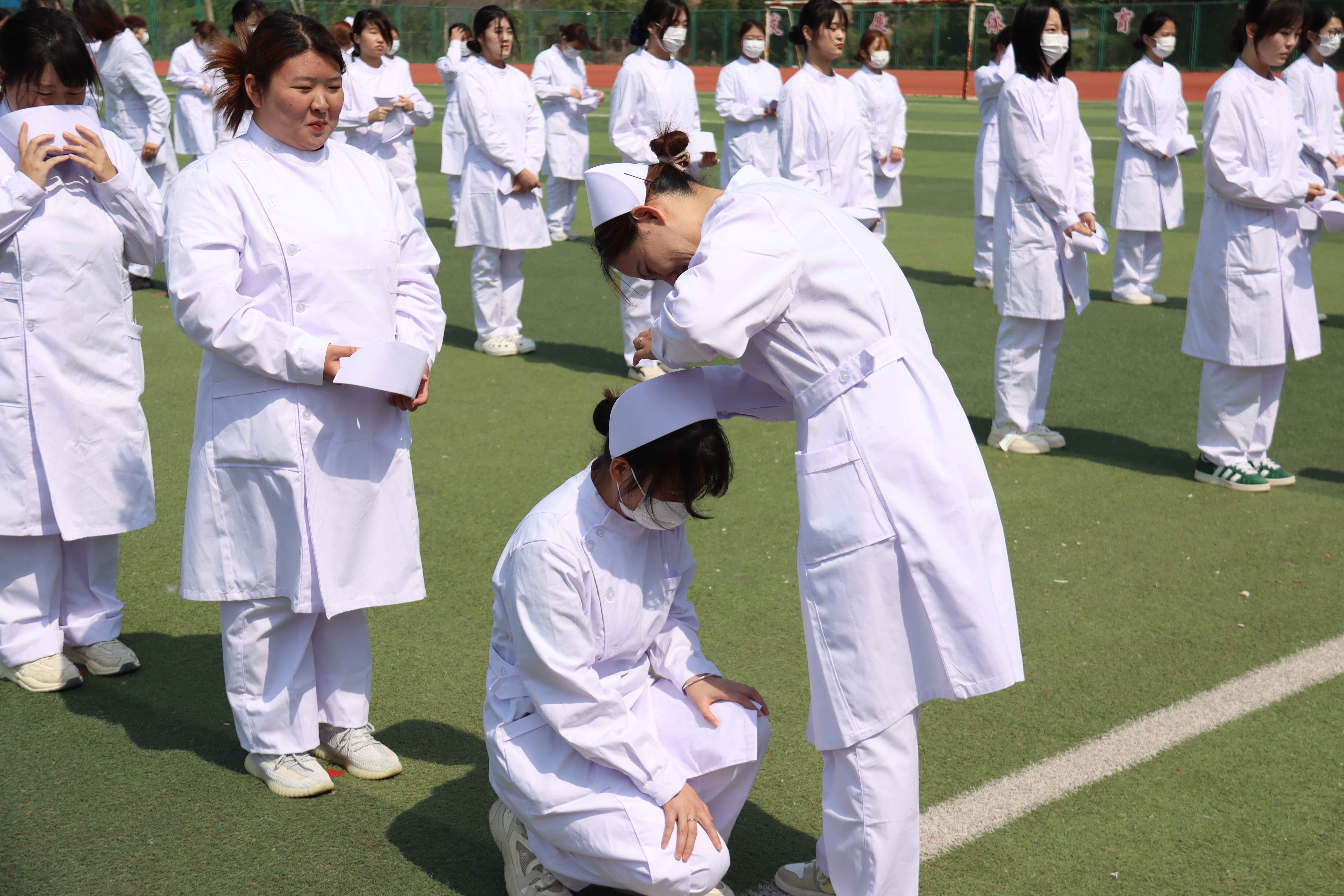 5月12日上午,医学护理学院2023年护士节授帽仪式在体育场举行。仪式上,医学护理学院范松梅宣布授帽仪式开始。伴随着庄严的乐曲,全体2021级护理专业学生依次走到教师面前,由教师戴上圣洁的燕尾帽。随后,在主持人的带领下进行集体宣誓。