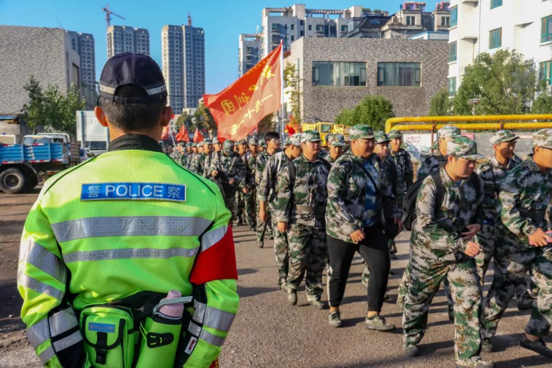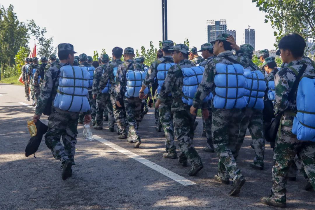 拉练活动中,学生们紧跟团旗、营旗,昂首阔步,拉歌互动;教官和辅导员履职尽责,全程守护;志愿者热情洋溢,暖心服务;营地前,铮铮誓言,震撼人心!