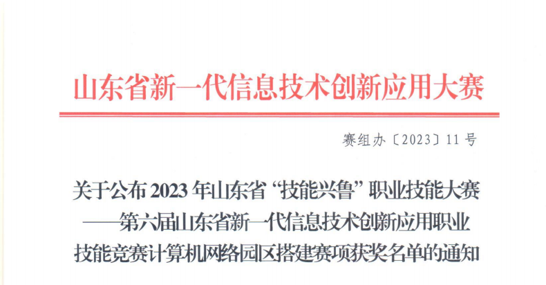 日前,山东省“技能兴鲁”职业技能大赛第六届山东省新一代信息技术创新应用职业技能竞赛——计算机网络园区搭建赛项决赛圆满落幕,经过激烈角逐,学院师生在该竞赛中共荣获14个奖项,其中职工组一等奖2项、二等奖2项、三等奖3项,学生组一等奖2项、二等奖4项、三等奖1项。