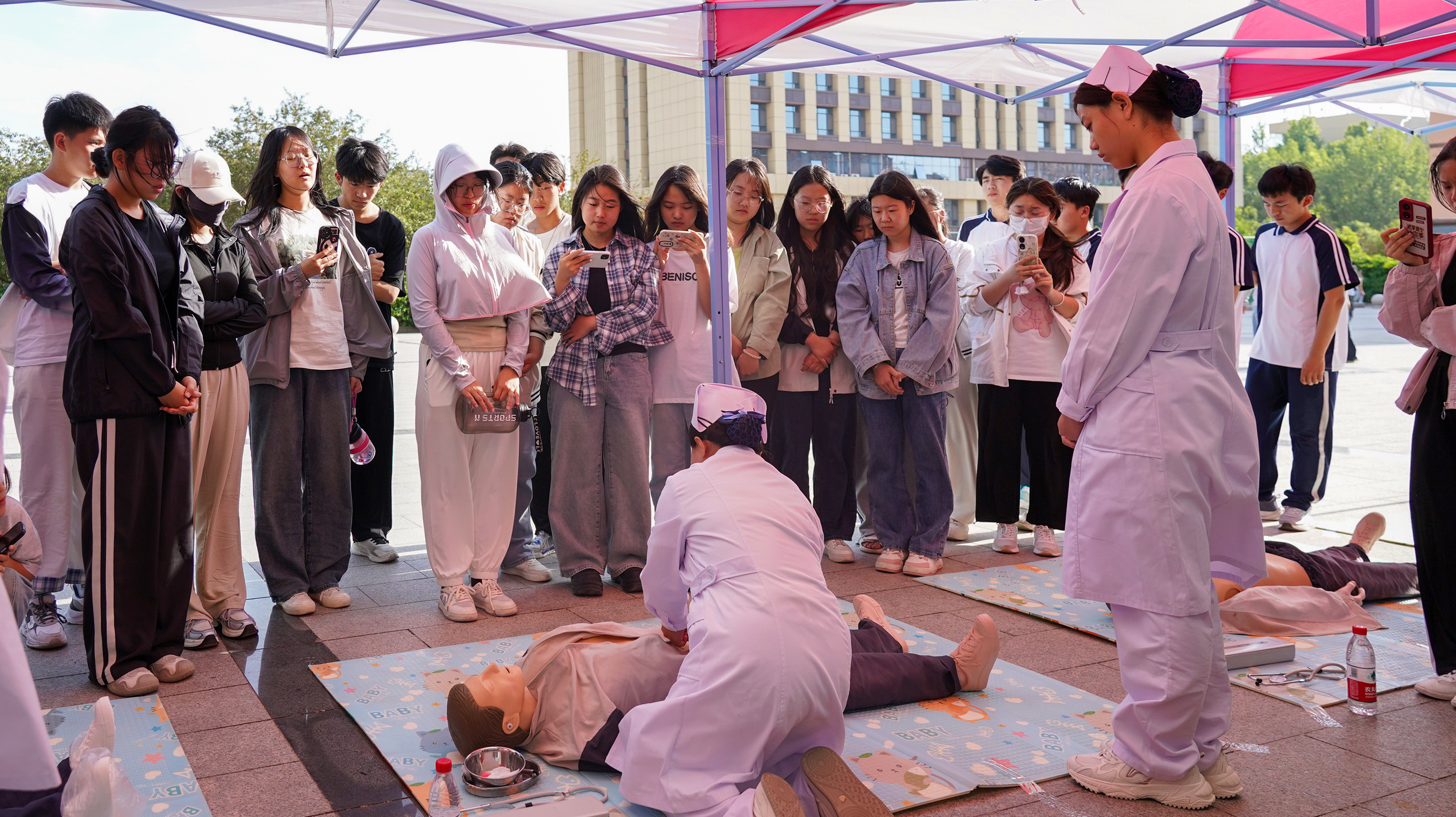 广场展位前,气氛热烈、人头攒动,中医推拿、颈腰按摩、血压测量、心脏复苏术、脉诊……各种极具中医特色的护理项目亮相展区,吸引众多师生围观体验。护理学子们发挥专业特长,现场提供测量血压、中医脉诊等服务,了解大家健康状况并细致作出相应指导建议;“推、搓、揉、按”——学子们凭借一系列专业的手法和娴熟的技术,为师生带来一次轻松、舒适的按摩推拿体验,帮助缓解身体疲劳与不适;展区内,专业人员还耐心讲解了应急救护相关步骤、心脏复苏基本方法等,对各个操作要领和流程进行示范,让现场师生更直观地掌握心肺复苏的正确操作方法,普及应急知识,提升救护技能。