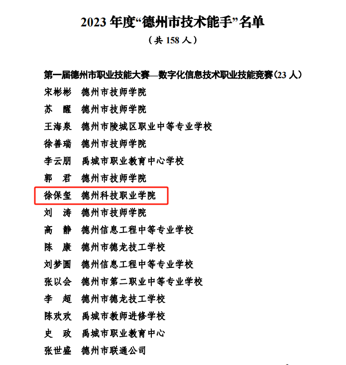 近日,德州市人力资源和社会保障局公布了2023年度“德州市技术能手”名单,学校4名教师凭借扎实的理论知识、丰富的竞赛经验以及娴熟的技能水平,被授予2023年度“德州市技术能手”荣誉称号。