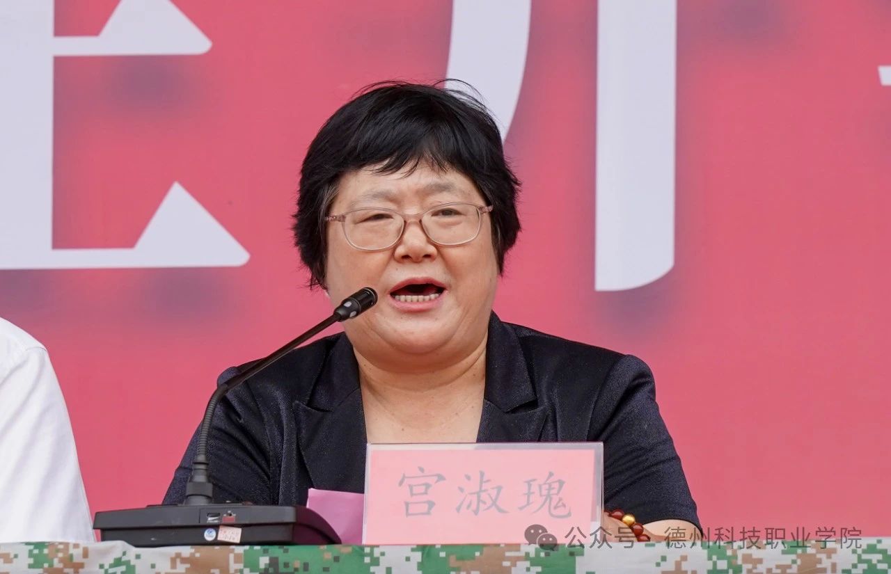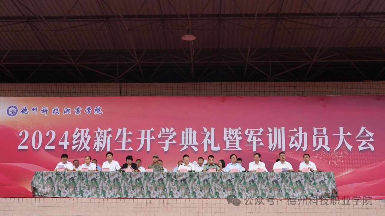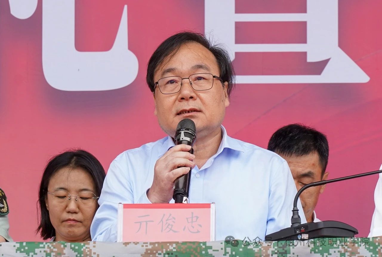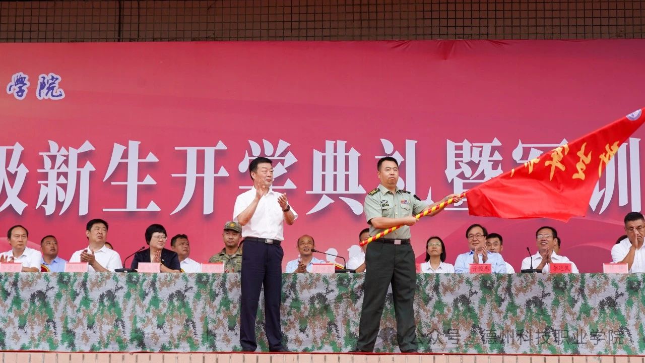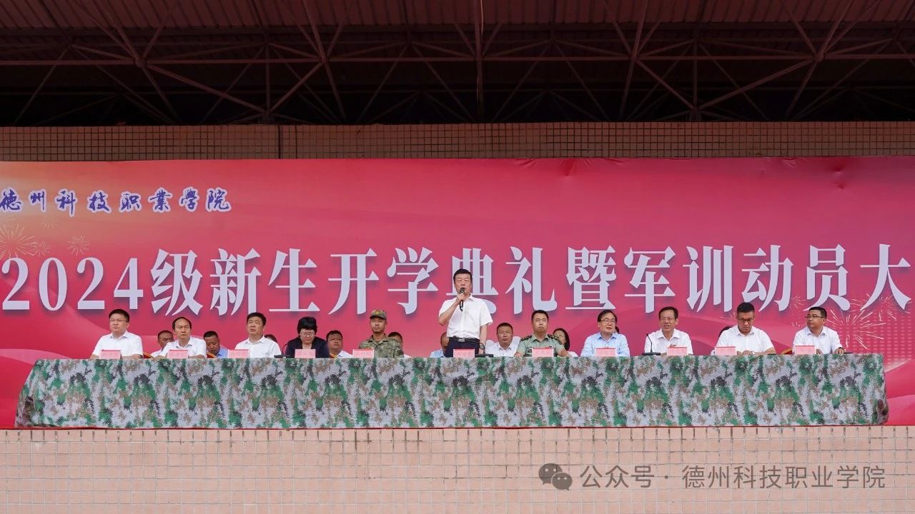 在热烈掌声中,校长亓俊忠作了讲话。亓俊忠首先代表学校全体师生向2024级新同学表示欢迎,向辛勤培育的教师、家人以及此次承训教官们表示感谢。他指出,自办学以来,学校始终肩负教育报国的光荣使命,一代代前辈先贤薪火相传,书写了躬耕教坛、强国有我的志向抱负,一批批德科学子砥砺奋进,绘就了紧跟时代步伐、勇于担当重任的奋斗篇章。