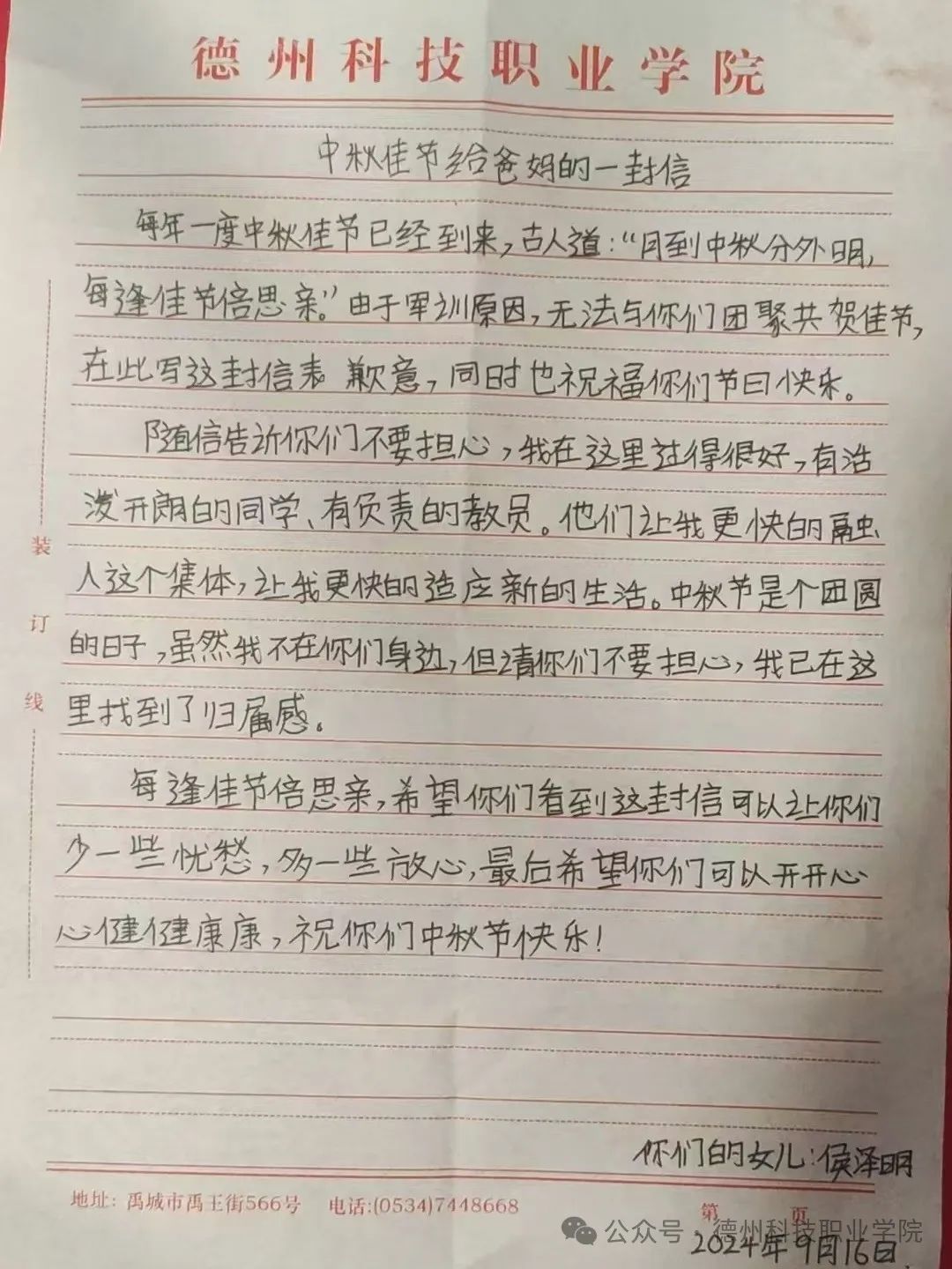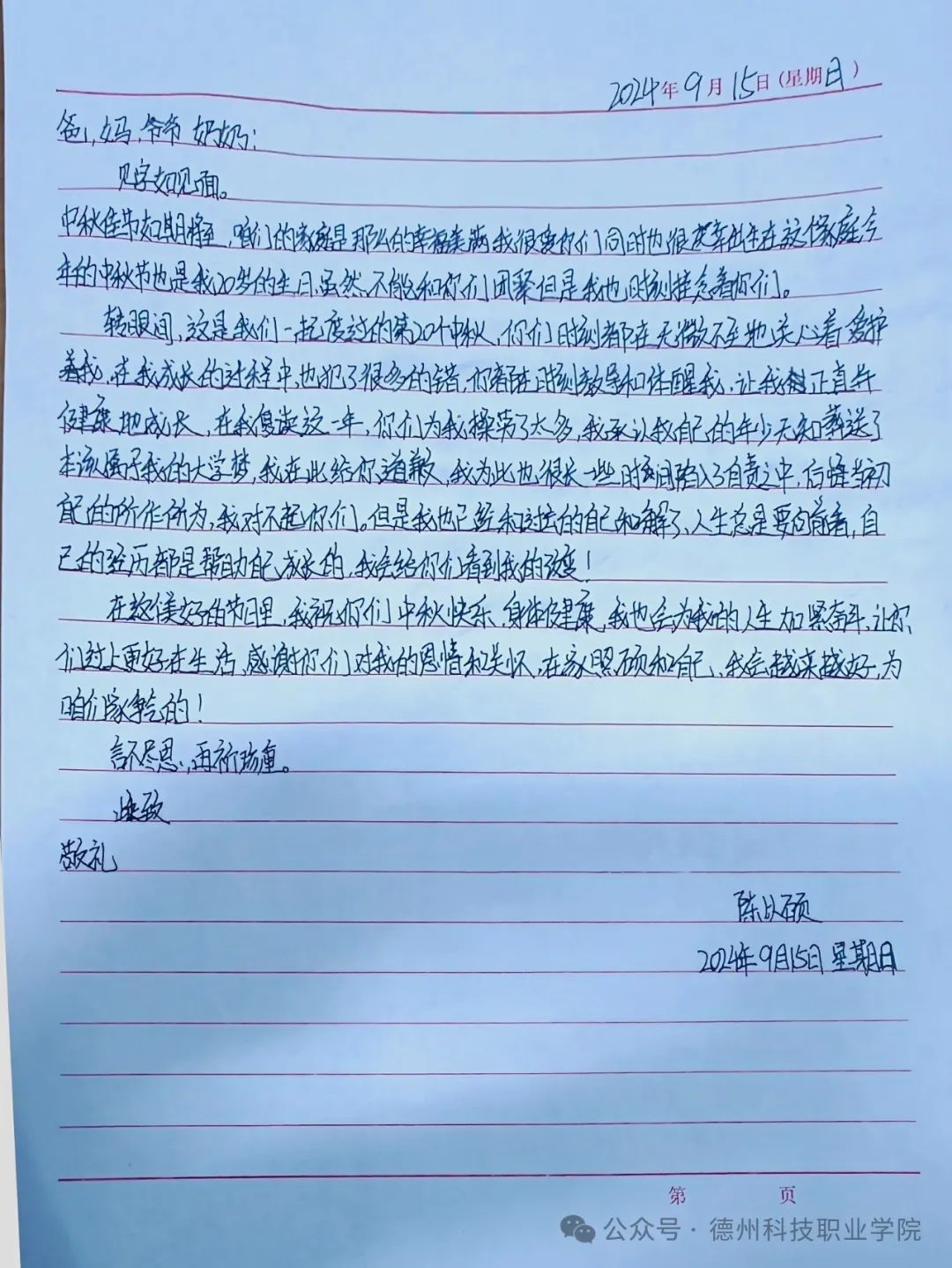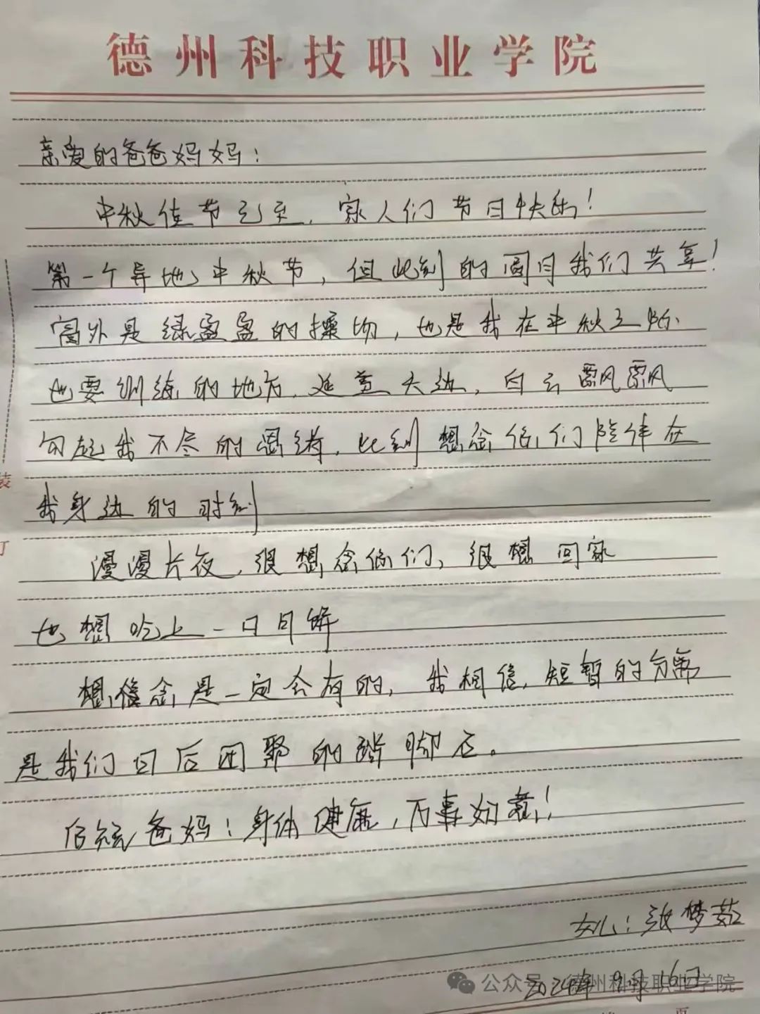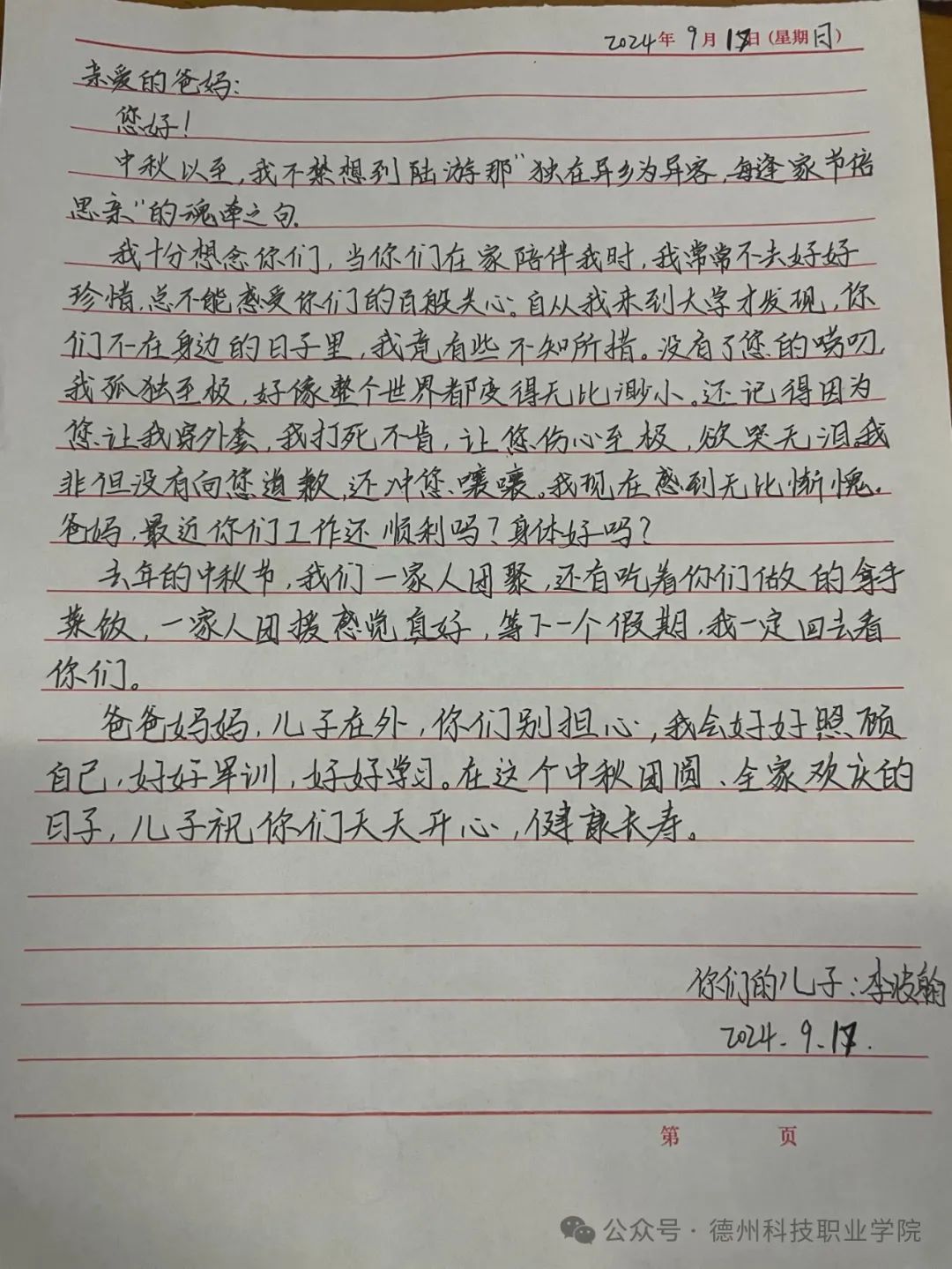 中秋节来临之际,学校举办了为父母写一封家书的活动,在这次活动中,我深刻体会到了在纸上写一封信和在微信上编辑信息的不同,纸质信更能体现出真实的情感,更能表达出我们对父母的爱意。我将对父母的感恩之情,思念之情转换为文字,写在纸上,寄予他们。这次活动,让父母和我之间更加了解。
