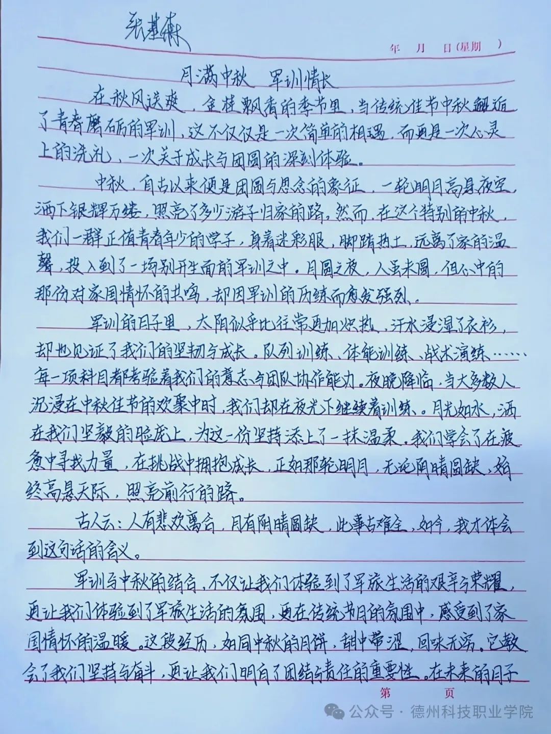 月光所照,皆是故乡;双脚所踏,皆是生活。愿大家事事顺心,中秋喜乐。我们在军训中学会了坚强,坚韧不拔的精神。未来的日子里,我们将继续在老师和教官的陪伴下,努力奋斗,追逐梦想。我们一定能够创造出更加美好的明天。