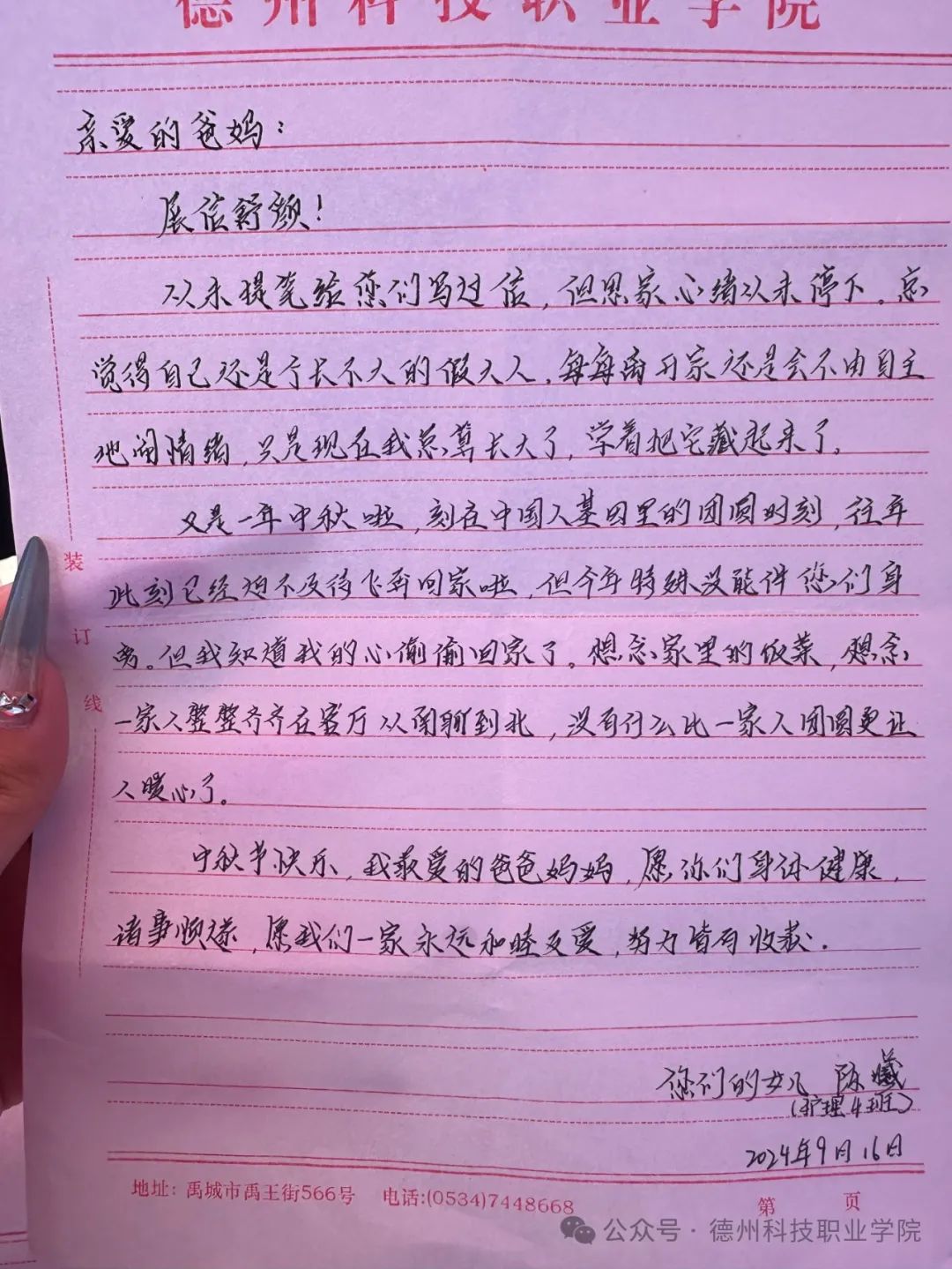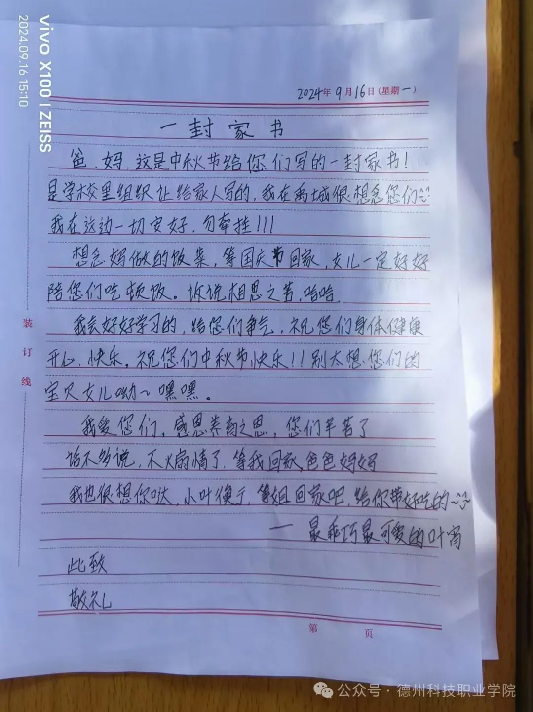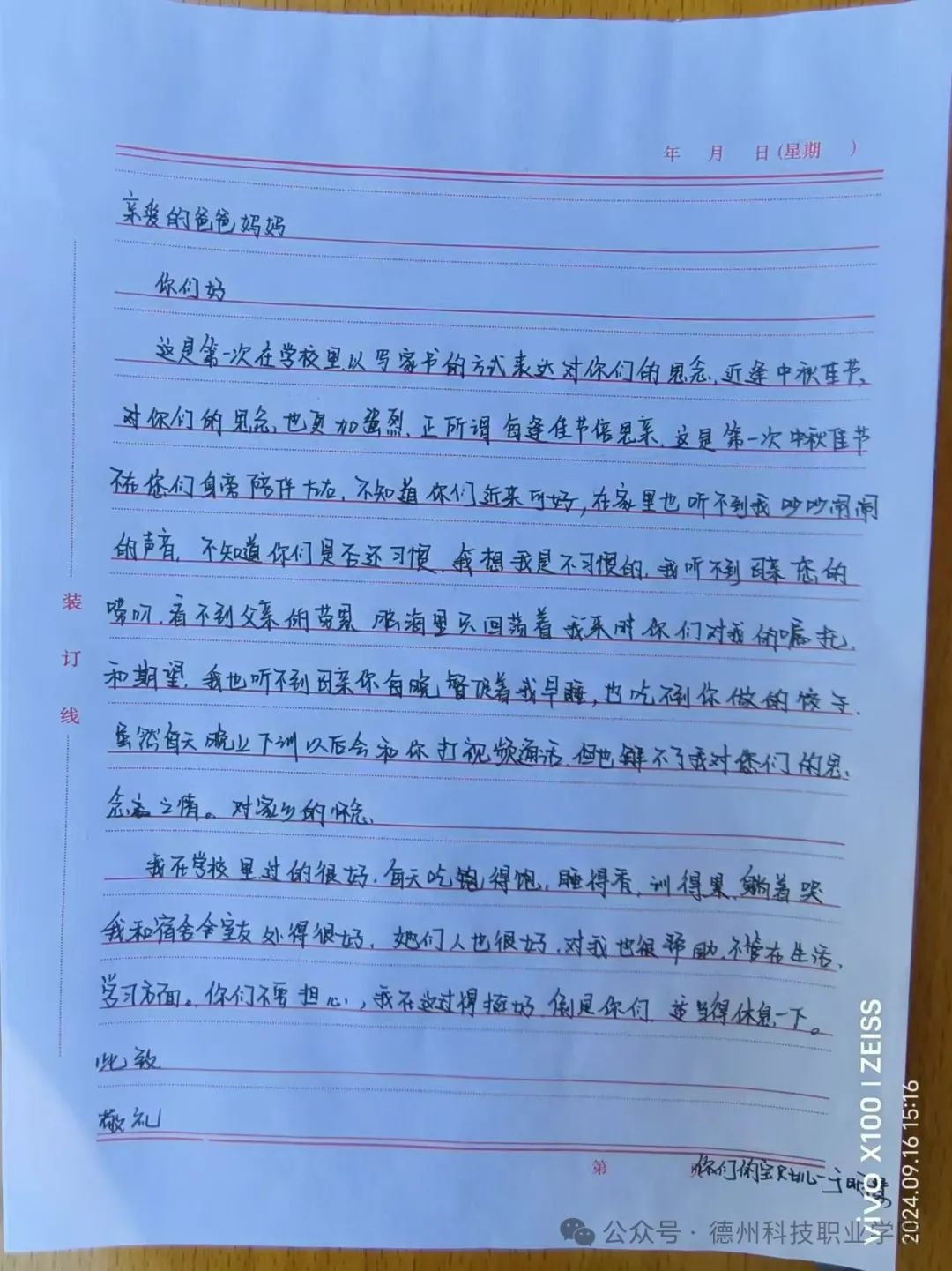 学校举办中秋节一封家书活动,感受到学校用心至极,让我与父母爱的距离又进了一步,他们收到家书之后,没想到我这么含蓄的一个女孩会这么勇敢的表达心中的爱意和情绪。让我感受到沐浴在父母的爱意之下,是无比幸福的事情。