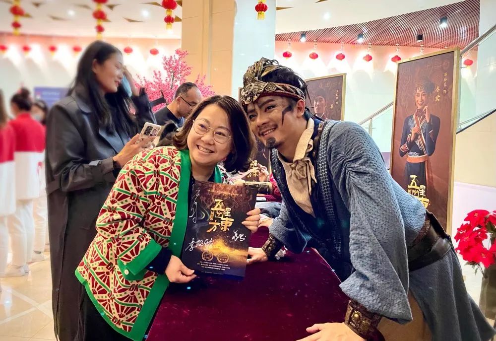 3月19日,在新疆和田,《五星出东方》表演结束后观众与演员合影。新华社记者 赵旭 摄