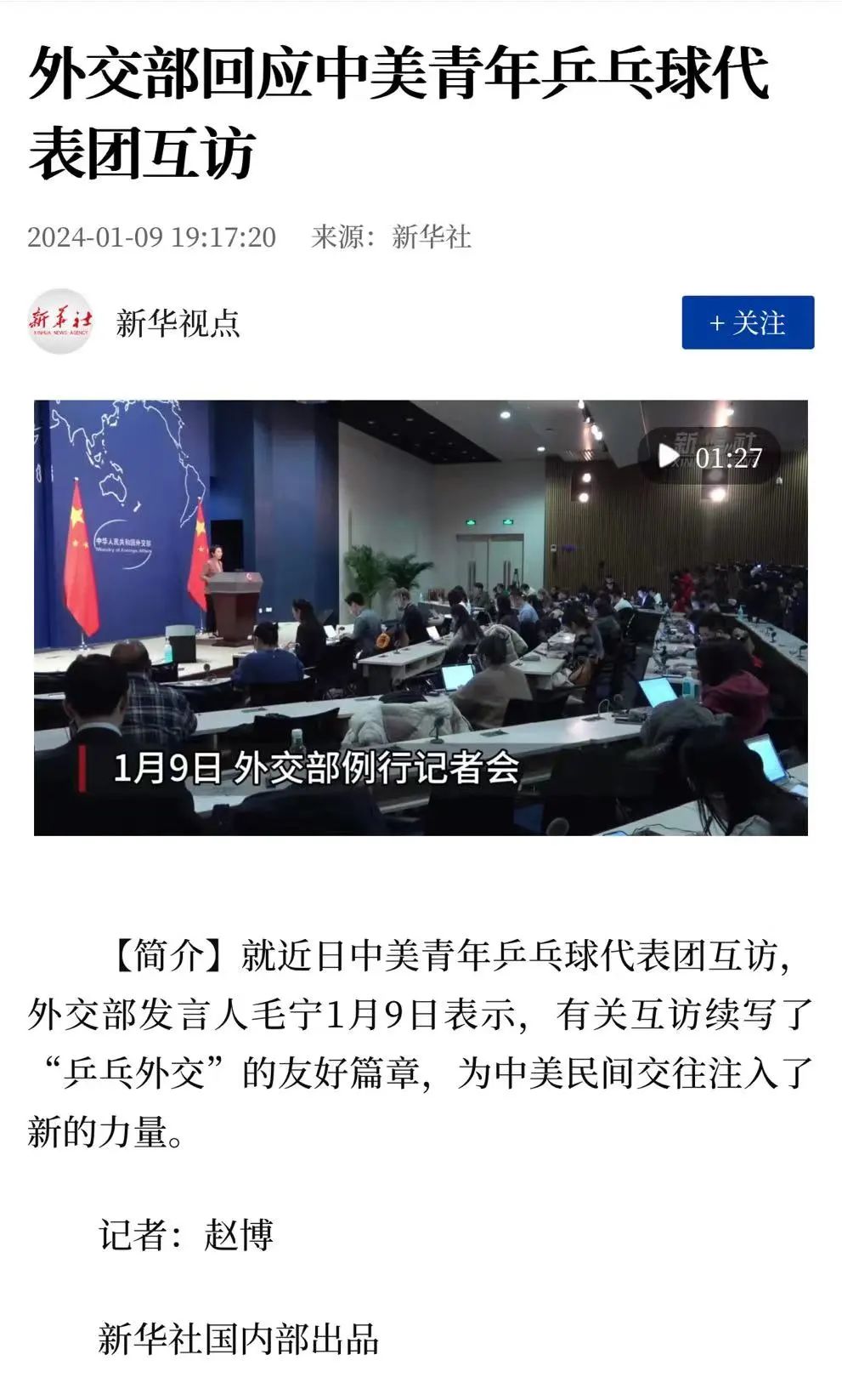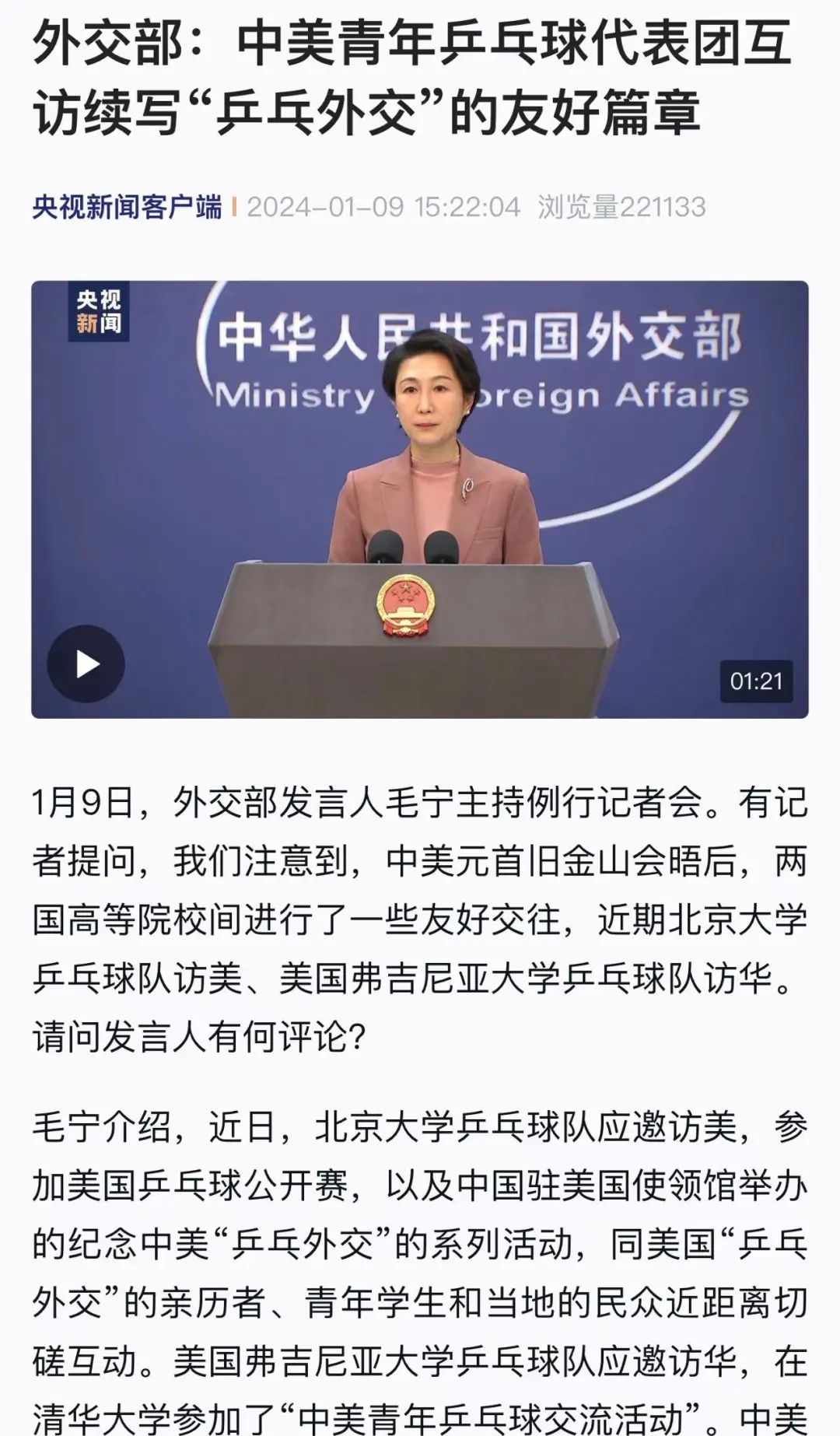 报道了1月9日,外交部发言人毛宁主持例行记者会。毛宁介绍,近日,北京大学乒乓球队应邀访美,参加美国乒乓球公开赛,以及中国驻美国使领馆举办的纪念中美“乒乓外交”的系列活动,同美国“乒乓外交”的亲历者、青年学生和当地的民众近距离切磋互动。美国弗吉尼亚大学乒乓球队应邀访华,在清华大学参加了“中美青年乒乓球交流活动”。中美青年乒乓球代表团互访续写了“乒乓外交”的友好篇章,为中美民间交往注入了新的力量。中美关系希望在人民、基础在民间、未来在青年、活力在地方。