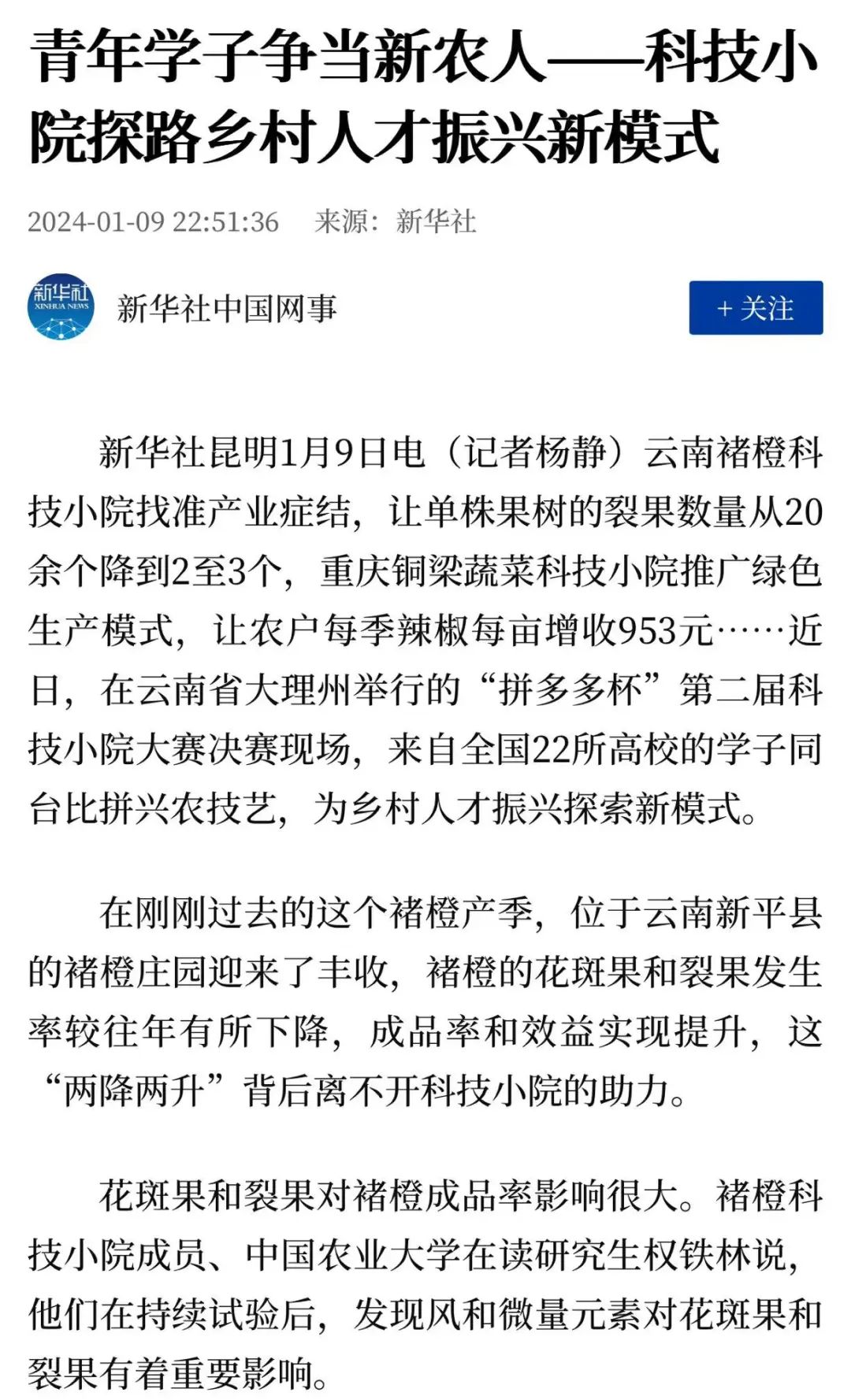 报道了近日,在云南省大理州举行的第二届科技小院大赛决赛现场,来自全国22所高校的学子同台比拼兴农技艺,为乡村人才振兴探索新模式。