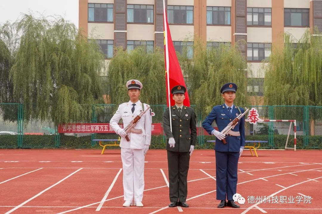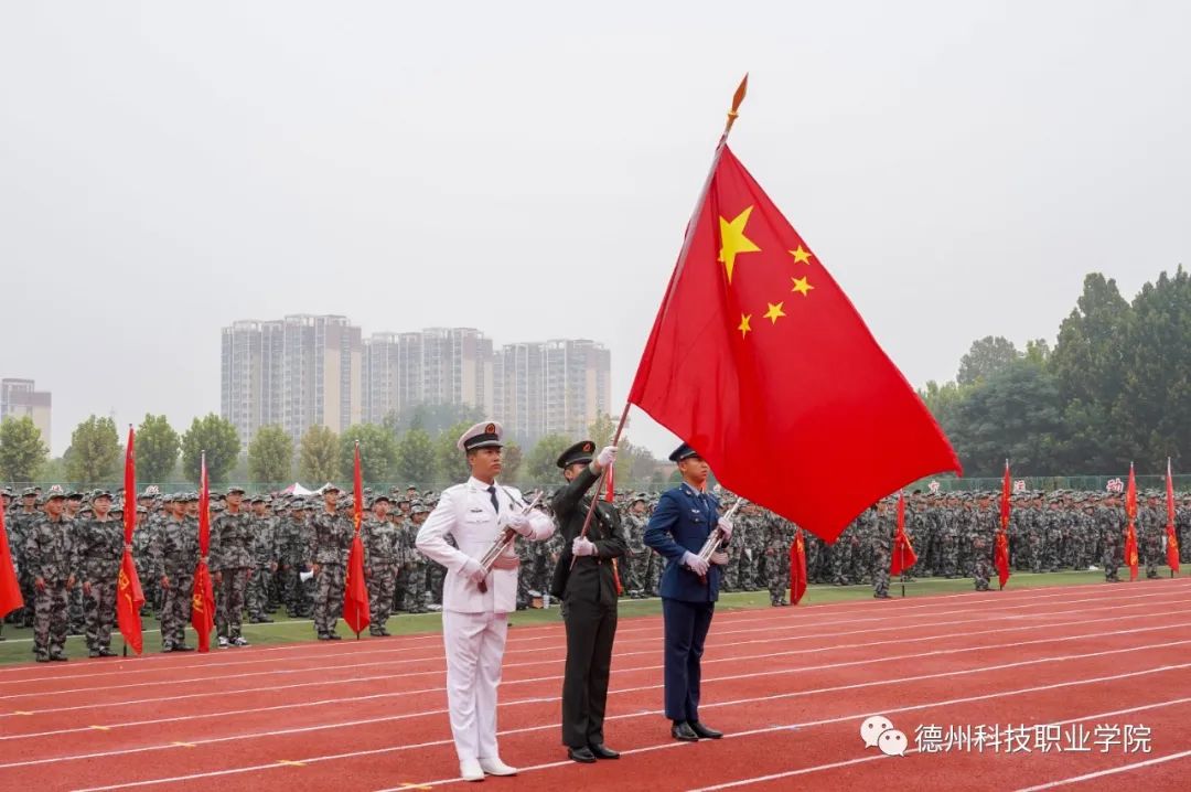 军训动员大会在雄壮的《义勇军进行曲》中拉开帷幕。国旗护卫队昂首阔步,护送鲜艳的五星红旗走到主席台前,全体师生肃立注目、奏唱国歌。