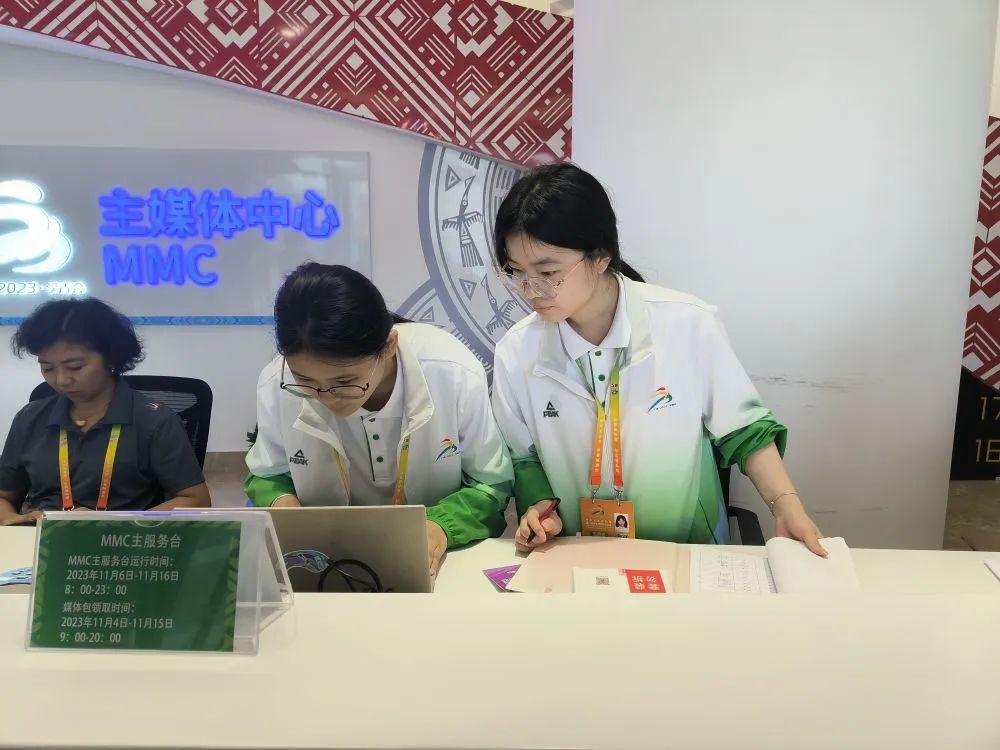 志愿者在学青会主媒体中心服务。新华社记者郭轶凡摄