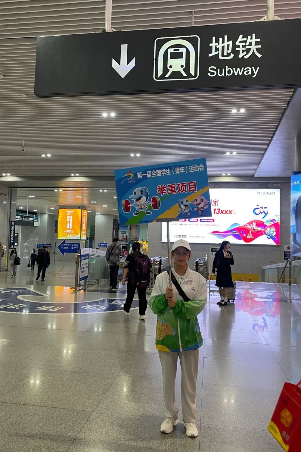 志愿者黄佳芹在南宁东站等待迎接学青会裁判员