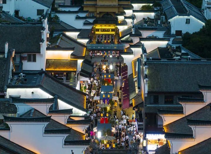 10月3日,游客在浙江省宁波市鼓楼步行街游玩(无人机照片)。新华社发(胡学军 摄)