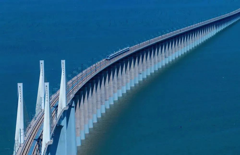 一列运行试验车组高速驶过湄洲湾跨海大桥。湄洲湾跨海大桥全长14.7公里,海域施工长度为10.8公里,是国内首座跨海高铁矮塔斜拉桥(9月19日摄)。