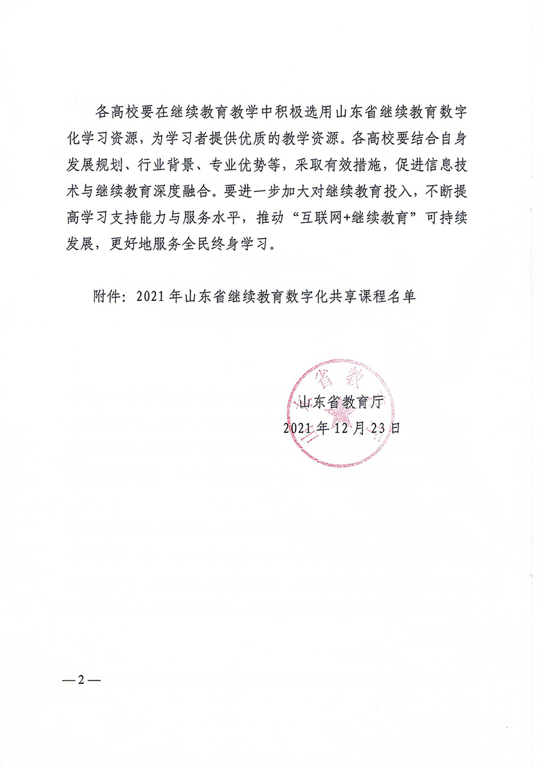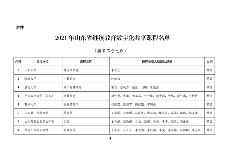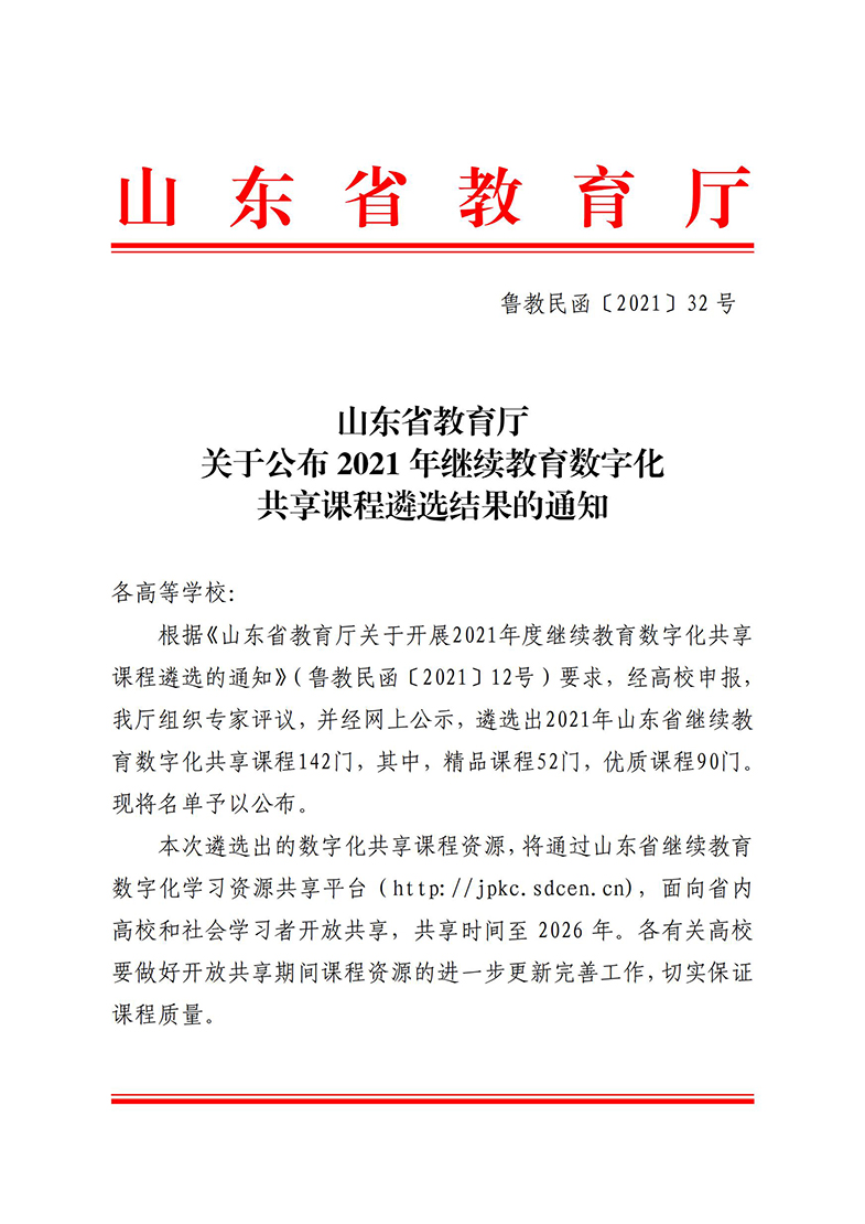 山东省教育厅 关手公布 2021 年继续教育数字化 共享课程遴选结果的通知