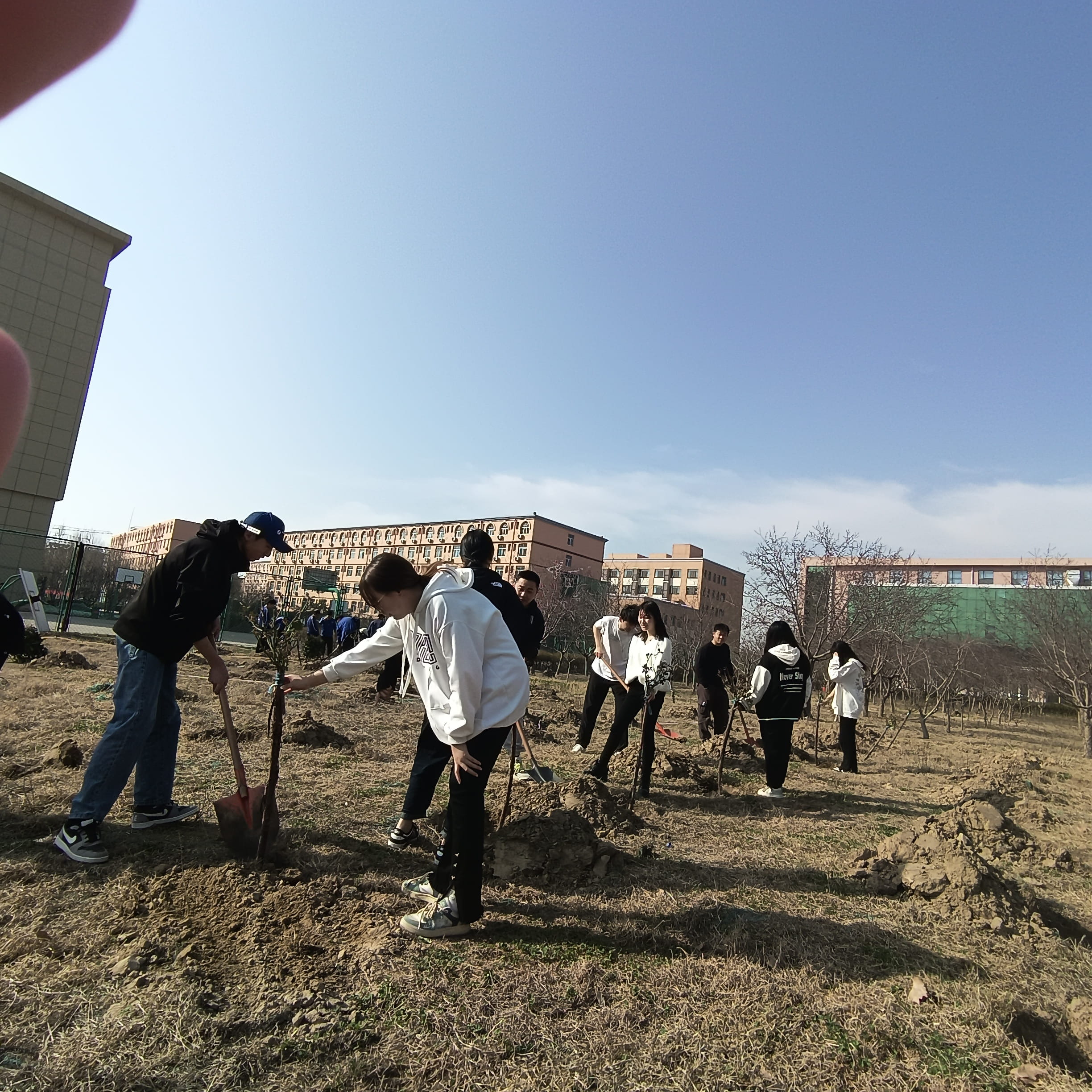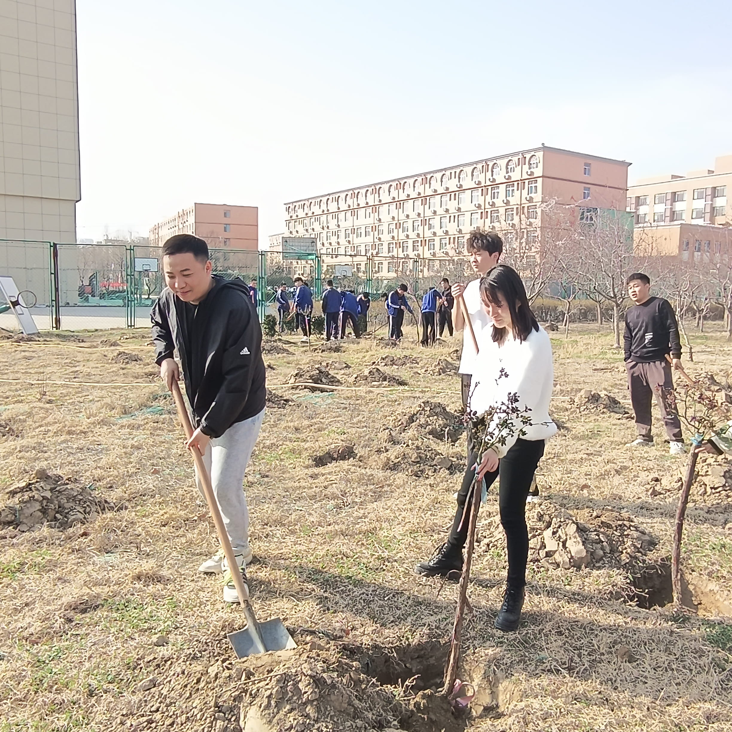 春回大地,万物更新。在三月上旬,我们信息财经系的志愿者们为我校篮球场建起了绿化,我们在篮球场的一面种植了许多小树苗。志愿者挥锹铲土,培土围堰,提水浇灌,经过老师和同学们的一番忙碌,一颗颗新树苗笔直挺立,生机勃勃,为我们的学校增添一抹新绿。