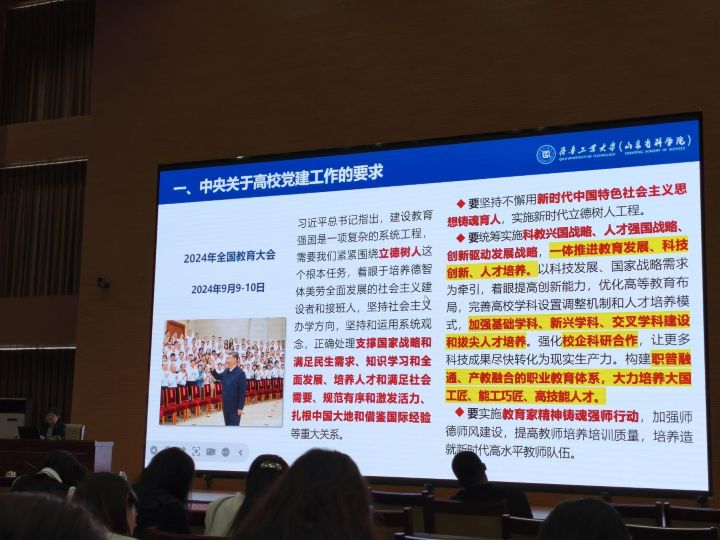 培训伊始,来自德州职业技术学院与山东华宇工学院的全国样板党支部书记及国家级高校 “双带头人” 教师党支部书记代表走上讲台,分享他们在党建工作中的宝贵经验与创新实践。德州职业技术学院的一位支部书记详细介绍了通过设立 “党员责任区”,引导党员教师在专业建设、课程改革中发挥先锋模范作用,成功带动专业整体发展的案例;山东华宇工学院的代表则聚焦党建引领下的科研团队建设,分享如何通过党建活动凝聚科研力量,攻克技术难题,实现产学研协同发展。这些生动的实践案例为参会者提供了可借鉴的实操经验,开拓了党建工作的新思路。