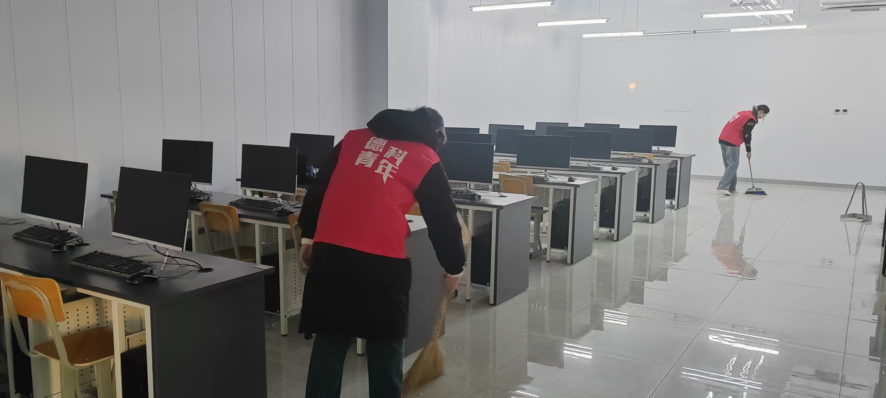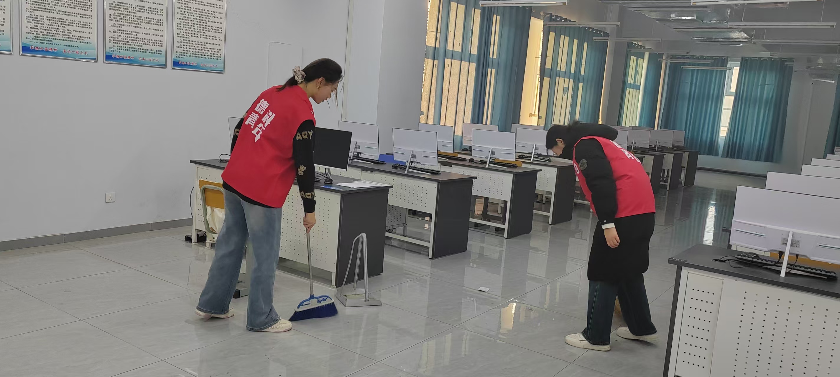 志愿者们身着统一的服装,手持清洁工具,准时来到实训楼前集合。在负责人的简短动员后,大家迅速分组,投入到紧张而有序的清扫工作中。有的志愿者负责清扫楼道,他们仔细擦拭着每一寸墙面,不放过任何一个卫生死角;有的志愿者则负责整理教室,他们将桌椅摆放整齐,清理讲台和课桌上的杂物,确保教学环境的整洁与舒适。