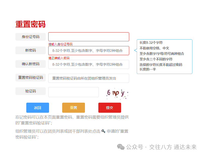 c.若密码遗失,请点击“忘记密码”,由原高中团委负责老师提供重置密码验证,进行密码重置。